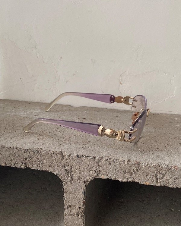 Gafas con cristal lila, montado al aire y detalles dorados en las patillas.