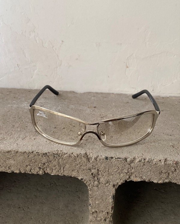 Gafas con cristal transparente espejado con marco plateado, patillas negras.